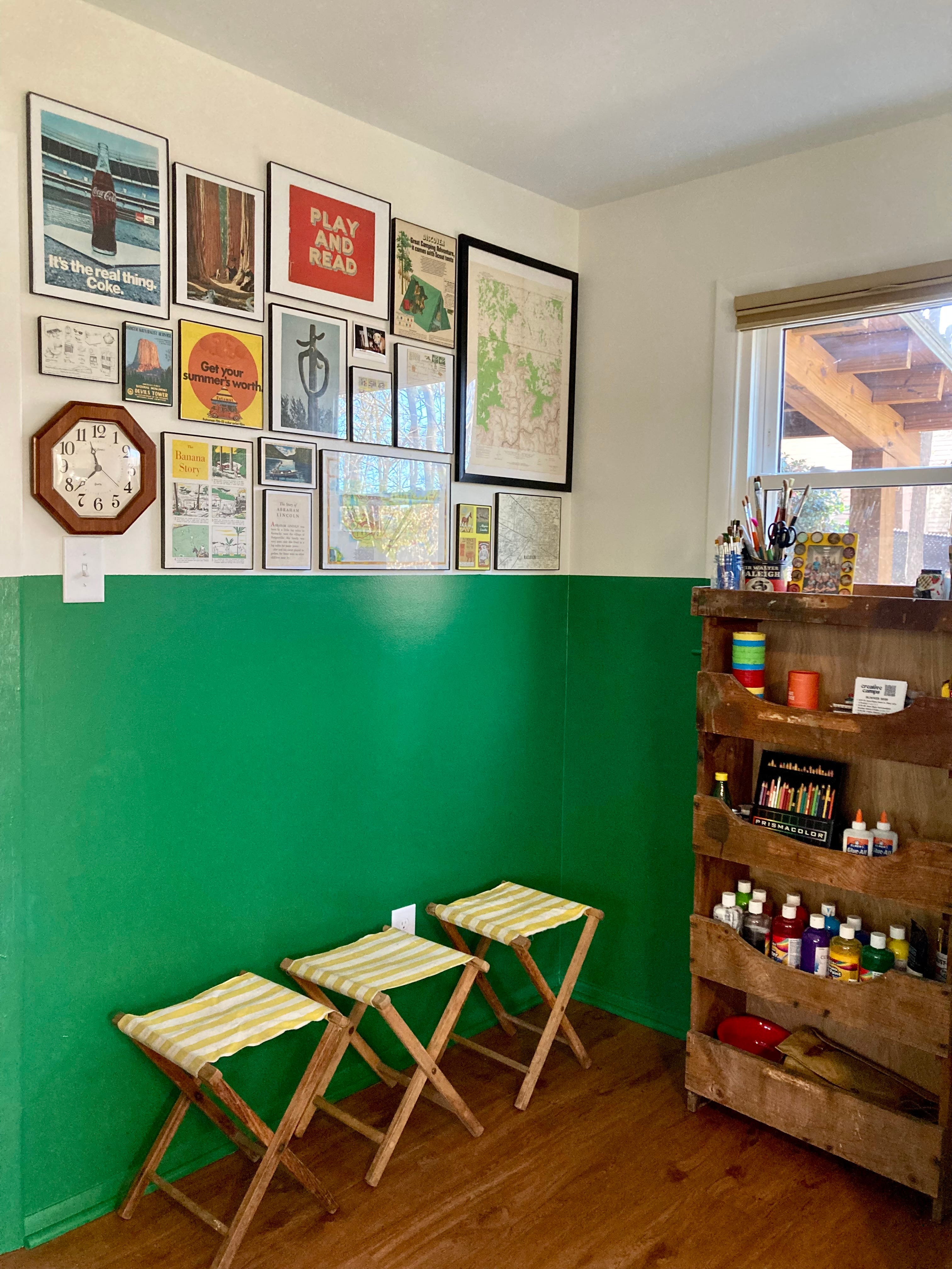 We have moved out of our Forest Park studio and are revamping a space 10 minutes southwest (exact address provided upon registration). Many fun, “classic camp cabin” touches are still to come, but here’s a sneak peak of a corner so far - featuring a fresh coat of Cactus Green + Megan’s family’s vintage camping stools.