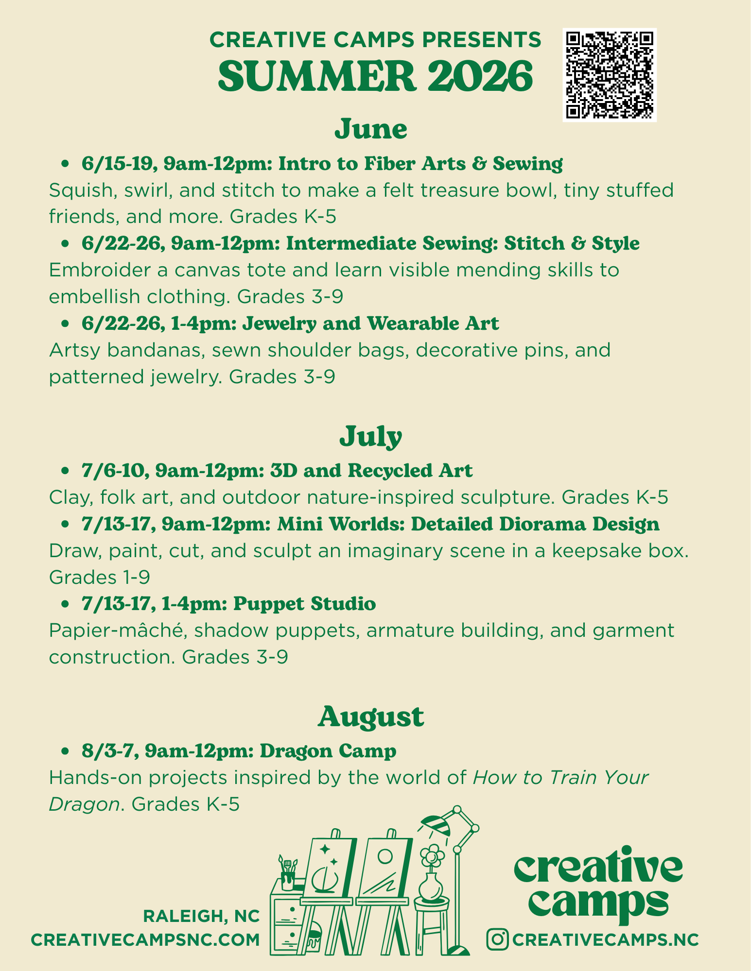 By request, we have changed the August camp (previously sculpture) into a specialized “How to Train Your Dragon” camp - check out the updated flyer below for details. Only 3 spots remain.